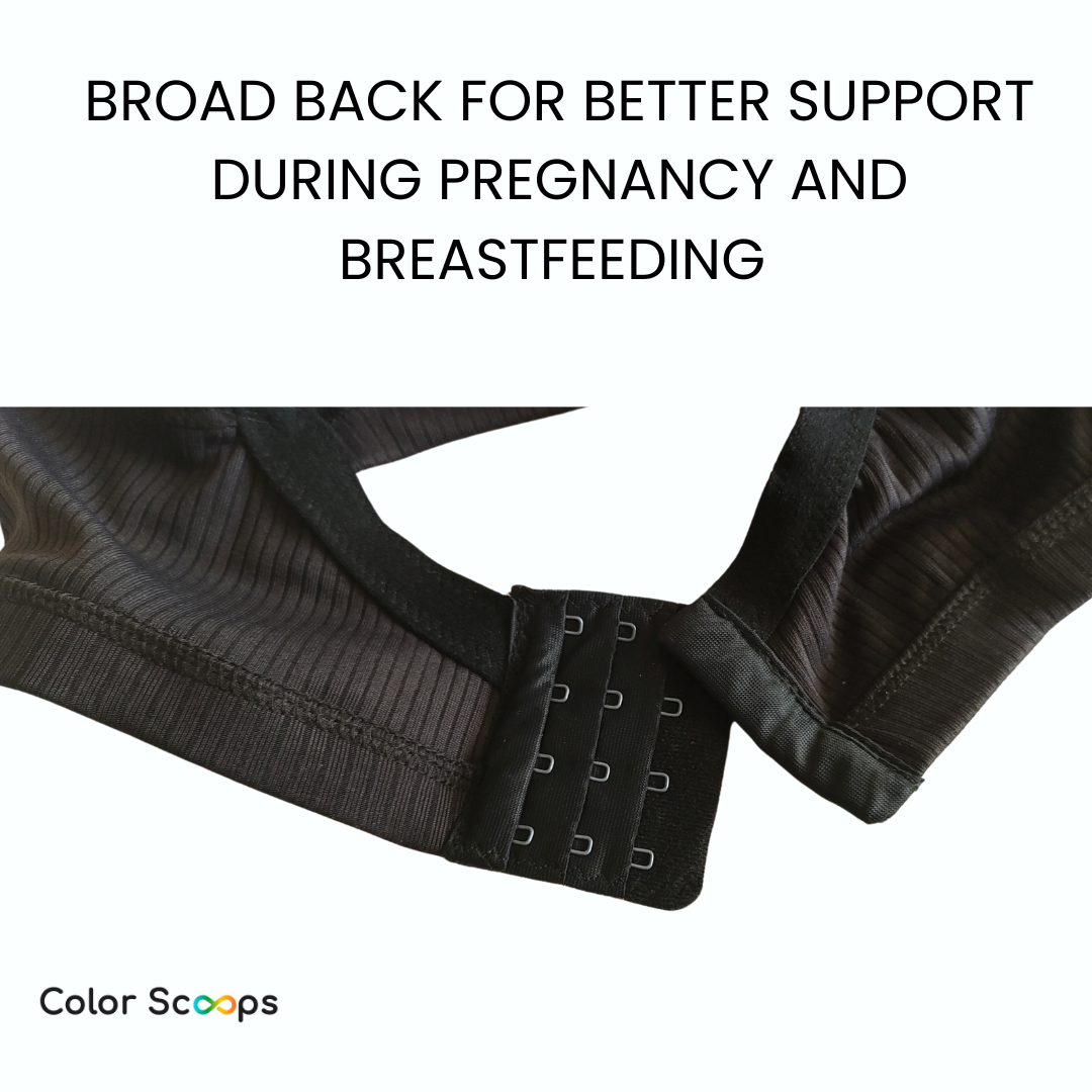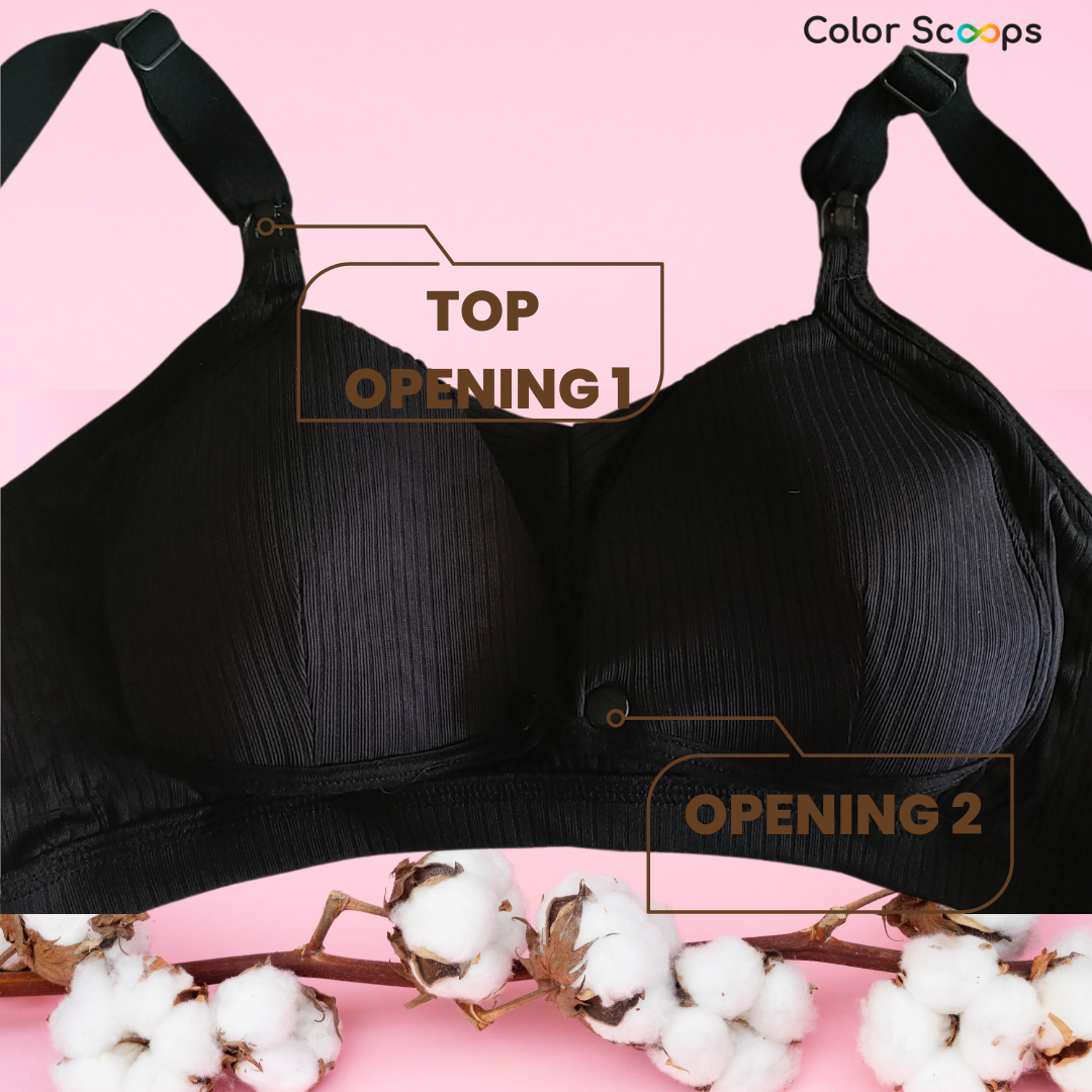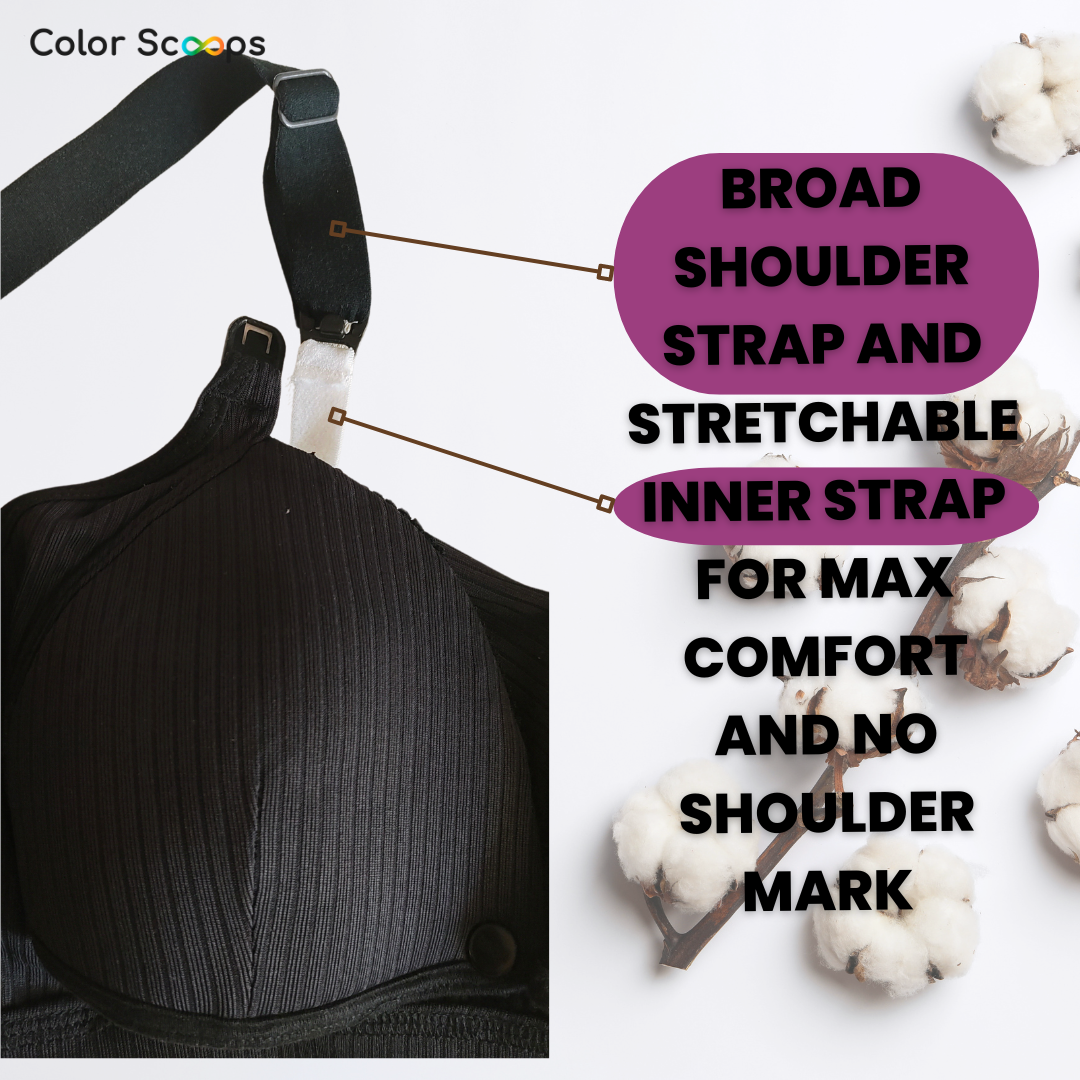 The inner stretchy strap offers extra elasticity to accommodate swollen breasts, ensuring no shoulder digging while providing a secure fit. Crafted with soft, breathable fabric, this maternity bra offers all-day comfort, making it ideal for postpartum engorgement and everyday wear. Color Scoops' feeding bra is wire-free, padded nursing bra, designed with full coverage and a broad back for support. It has a two-way opening for convenient nursing, the top clasp and the front clasp or tick button in order to provide comfort to the new mom while feeding the baby in multiple position. Color Scoops breastfeeding bra has an inner elastic that adjusts when breasts are full and avoids digging in shoulder. Made from breathable cotton, it's ideal for postpartum and breastfeeding / nursing moms seeking easy access and superior fit